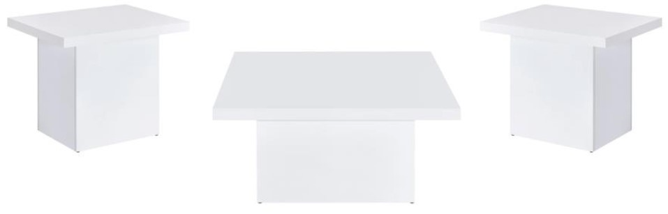 Each table includes a plinth-style base and thick square top for clean visual symmetry