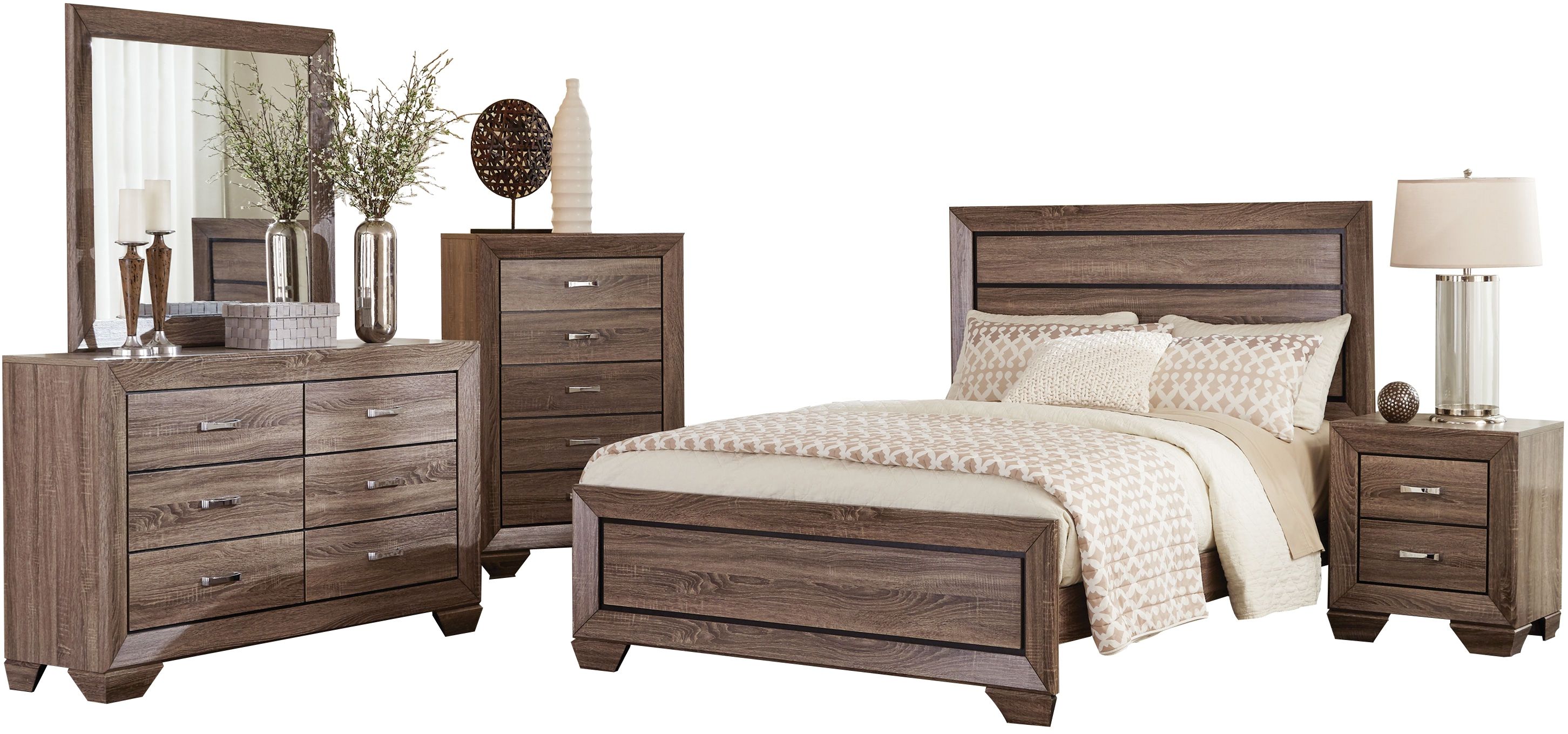 Feel refreshed every time you step into your bedroom with the Kauffman collection. The natural oak grain, tapered feet, recessed black grooves and picture-frame design meld rustic sentiments with contemporary flair. Coupled with storage options, this CoasterEveryday collection is exactly what you need for your ideal dream retreat.