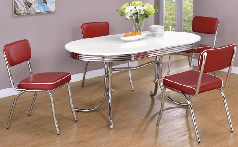 Revisit the festive era of soda shoppe décor with a charming and iconic five-piece retro dining set. A classic oval dining table offers your casual space a romantic walk back to a past era with its ellipse edge profile and shiny top.Read More