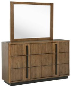 Amplify the modern artistry of your bedroom with a stylish six-drawer dresser and mirror combination. Delivering chic flair with vertical fluting, the dresser and framed mirror feature a cool ash brown wood grain finish with dark details in vertical pulls and a recessed base.Read More