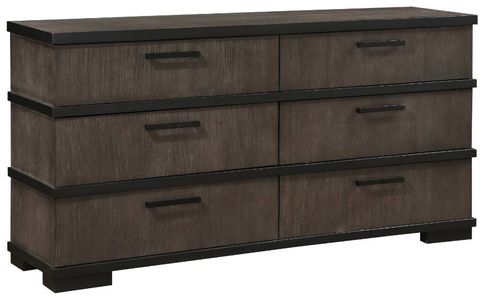 Modern lines pair with texture and hue to create the dynamic look of the Acworth Collection. The two-tone brownish gray and black finish over oak veneer of the collection lends to the modern-industrial inspired aesthetic that comprises the collection’s design. Black bar hardware fronts the drawers of the dresser.Read More