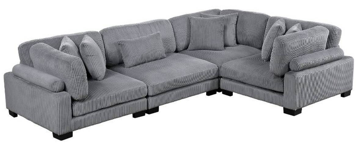 Configurable to your available space, the Traverse collection allows for the addition and detachment of pieces for a customized seating experience. The 4-piece sectional configuration consists of three corner units paired with one armless chair. The corduroy fabric upholstery creates a plush expanse for a soft touch experience.Read More