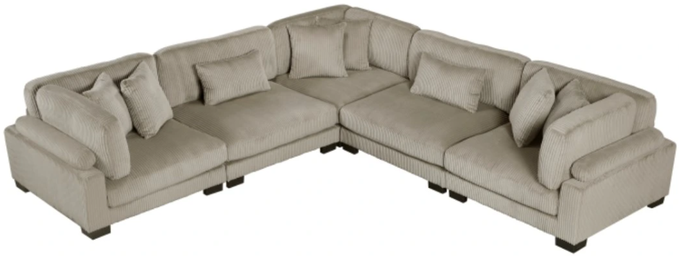 Configurable to your available space, the Traverse Collection allows for the addition and detachment of pieces for a customized seating experience. The 5-piece sectional configuration consists of three corner units paired with two armless chairs. The taupe corduroy fabric upholstery creates a plush expanse for a soft touch experience.Read More